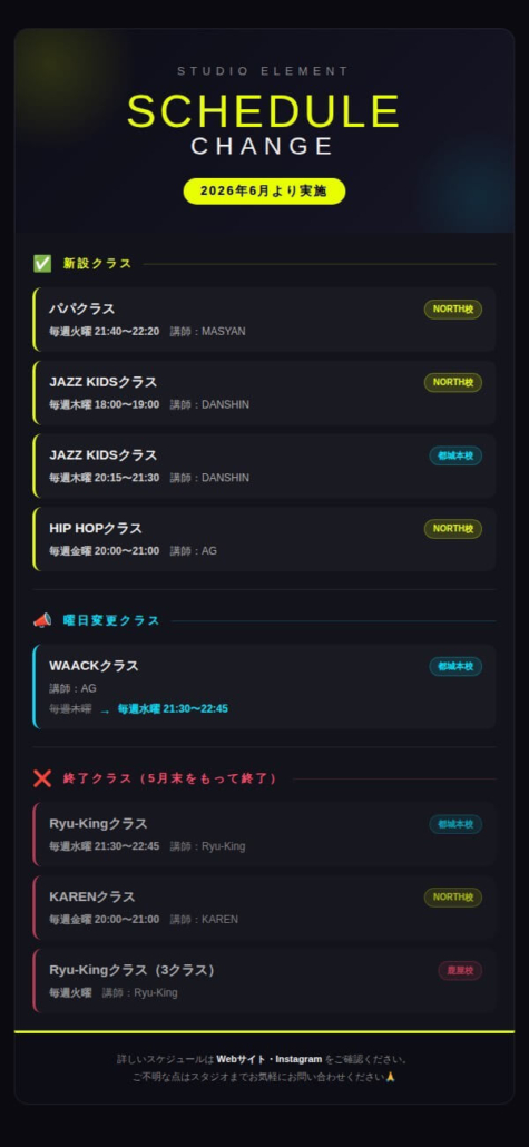 スタジオ施設の維持・改善を目的に、誠に勝手ながら2026年6月より月謝を改定させていただくこととなりました。